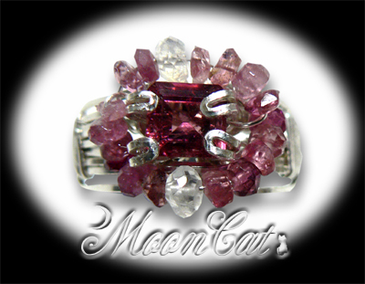 ピンクトルマリンのエメラルドカットのルースをスターリングシルバーワイヤーでラッピングしてまわりをピンクトルマリンとムーンストーンのカットビーズで飾りました。